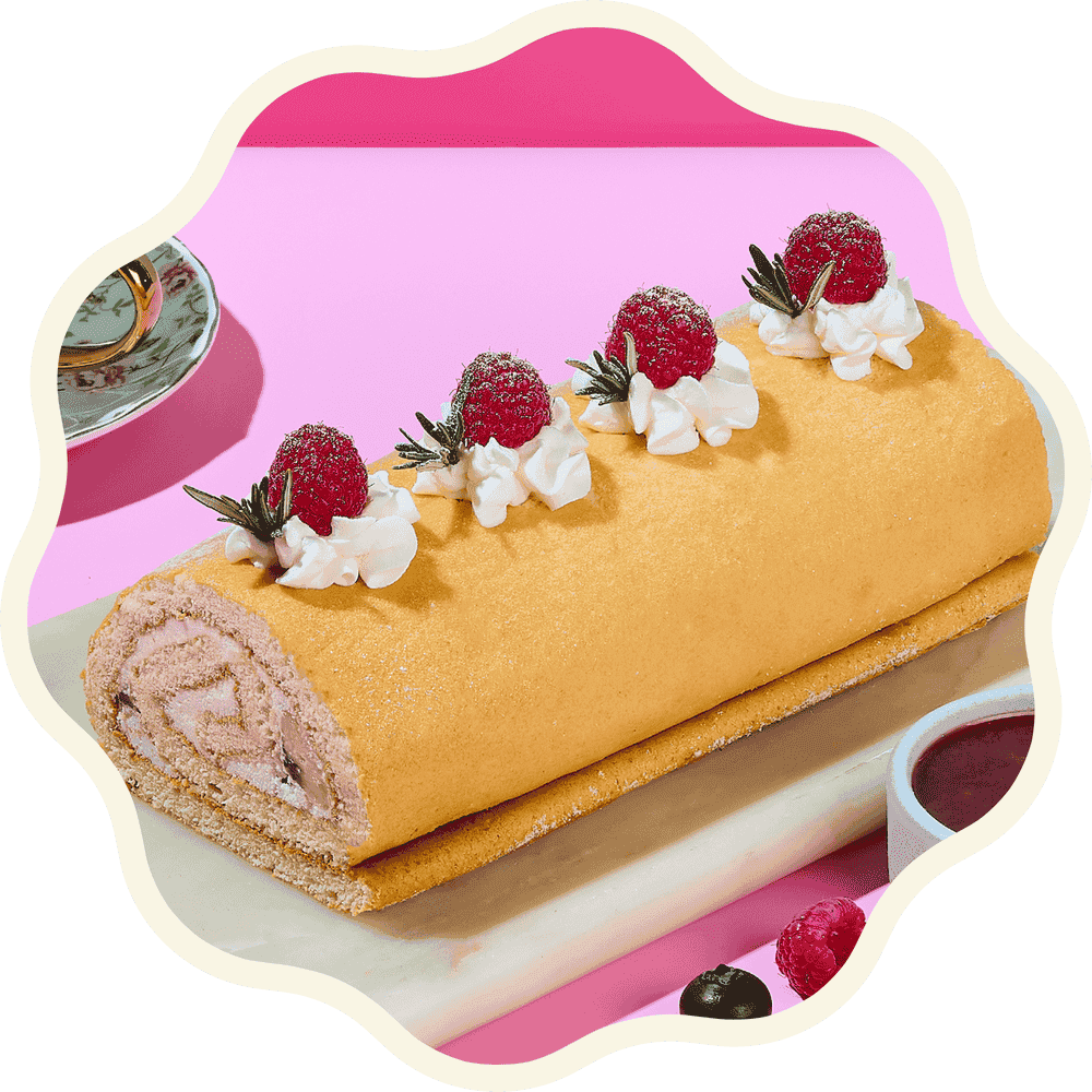 added sugar 0, trans fat 0. Light, fluffy Swiss roll layered with a creamy banana filling and a touch of raspberry for freshness. Soft, gently sweet, and perfectly balanced for a delightful anytime treat. Served with strawberry jam on the side. 470 g • Zero Added Sugar • Gluten-Free • GMO-Free • Organic • Soy-Free • Yeast-Free