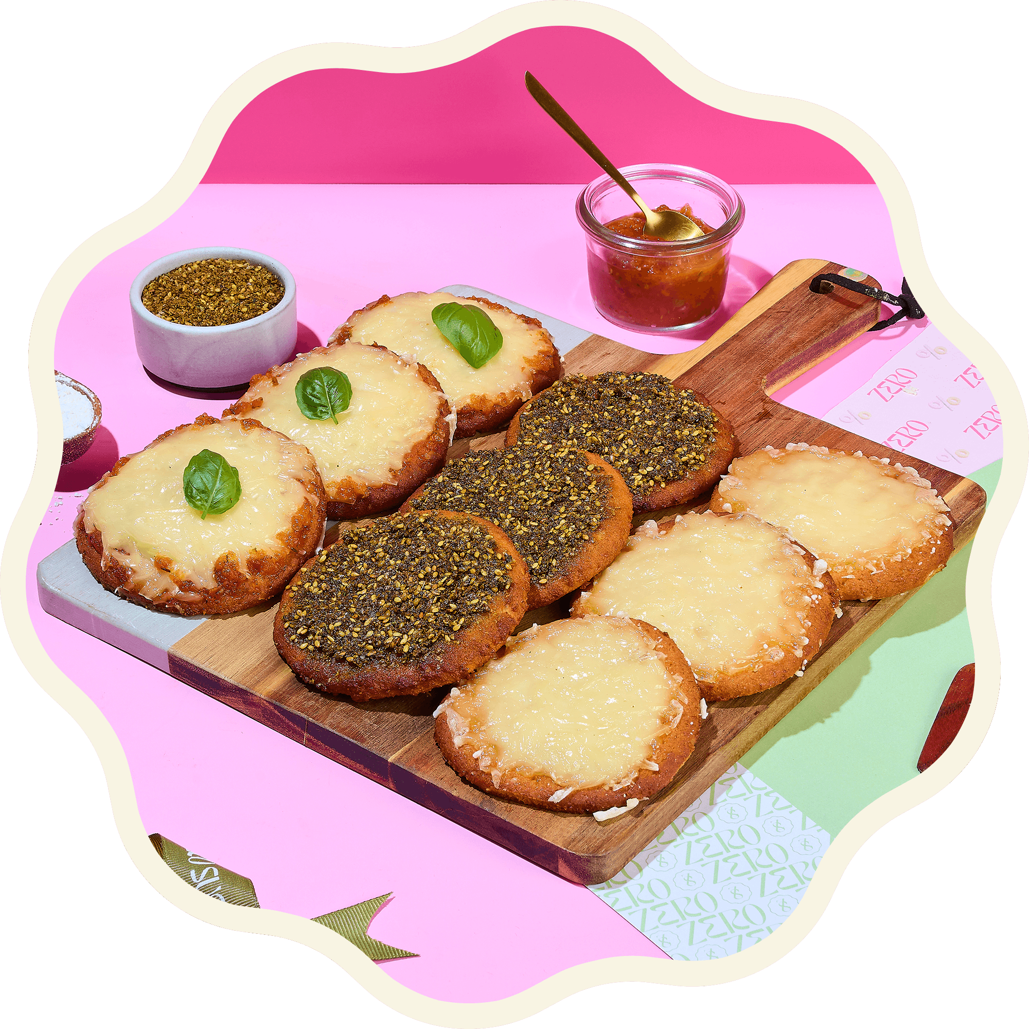 A delicious trio of mini pizzas, perfect for sharing. Includes 3 Mini Margherita Pizzas, 3 Mini Cheese Pizzas, and 3 Mini Zaatar Pizzas—light, flavorful, and ideal for a wholesome snack platter. Enjoy with 3–4 people for a satisfying, guilt-free treat. • Zero Added Sugar • Gluten-Free • GMO-Free • Organic • Soy-Free